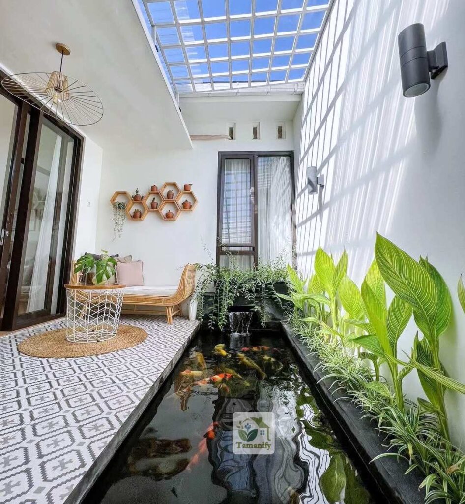 Lahan terbatas bukan penghalang untuk memiliki kolam koi. Dengan perencanaan cermat, kolam dapat dirancang memanjang mengikuti sisi dinding atau ditempatkan di sudut halaman.